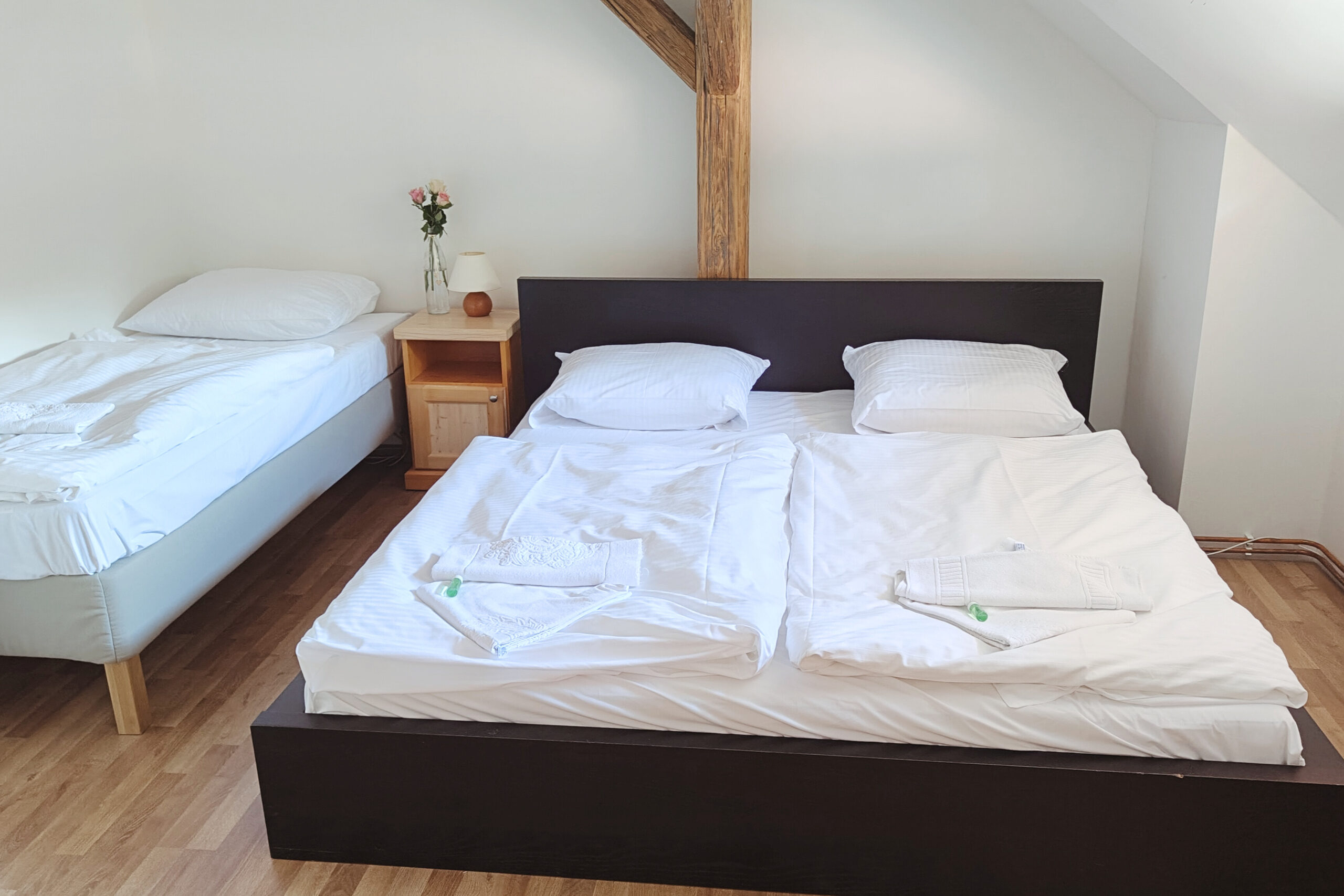 V penzionu nad restaurací nabízíme k pronájmu v podkrovním prostoru tři pokoje a jeden apartmán. Všechny pokoje mají samostatnou koupelnu s toaletou a úložné prostory. Každý pokoj je taktéž vybaven ložním prádlem a ručníky. Na každém pokoji najdete televizi. Ubytování s domácím mazlíčkem je možné po předchozí domluvě.